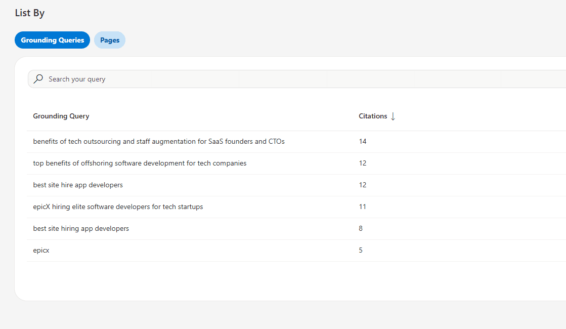 New grounding queries appearing in your dashboard are content opportunities. If you spot a query you don't have dedicated content for, build it. Treat grounding queries the way you'd treat a keyword gap analysis — they show you exactly what Bing's AI is searching for when it retrieves sources.