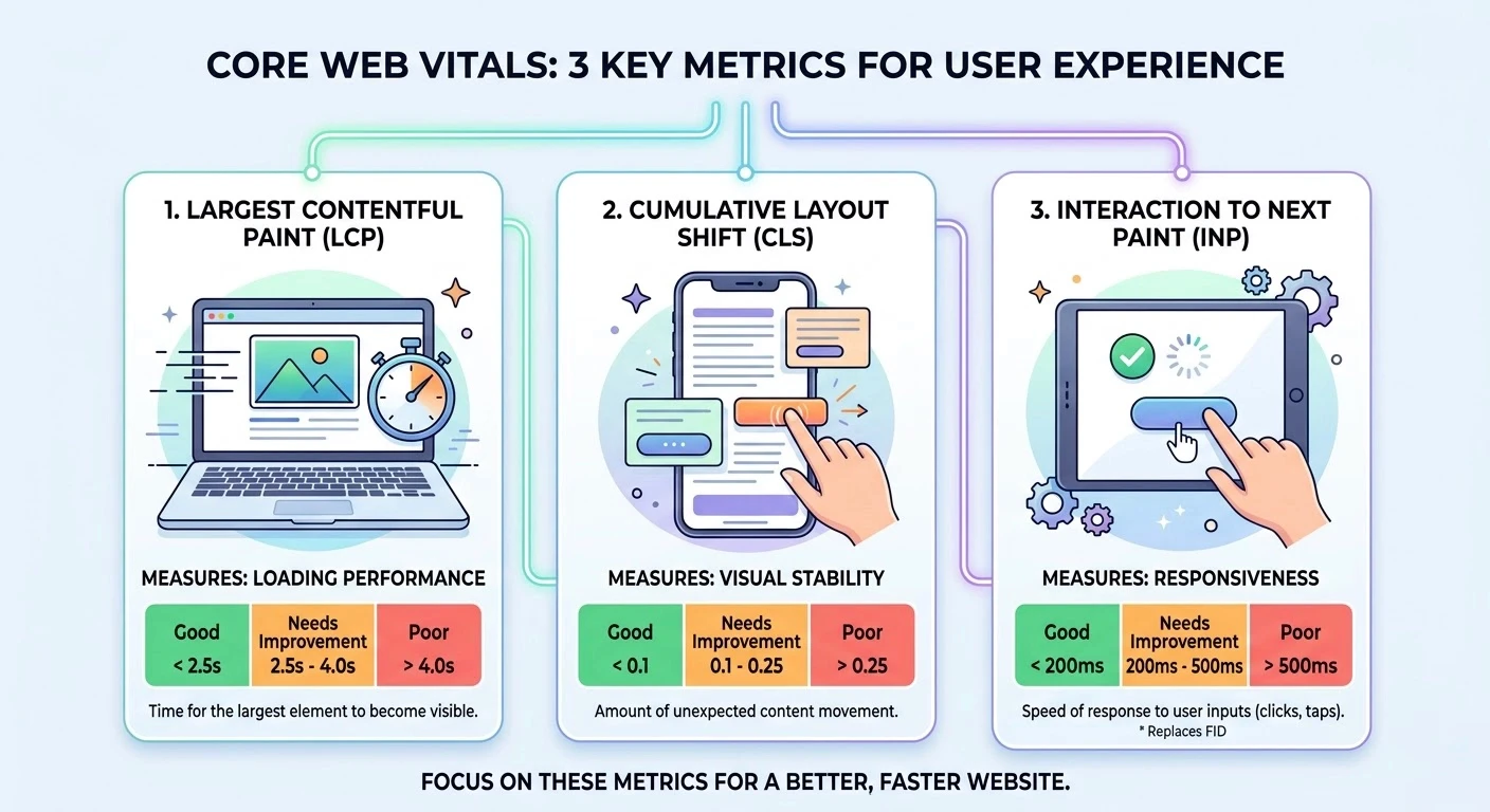 Google defines 'Good' thresholds as: LCP under 2.5 seconds (largest content element is rendered quickly), INP under 200 milliseconds (page responds quickly to all user interactions), and CLS under 0.1 (minimal unexpected layout shifts during loading).