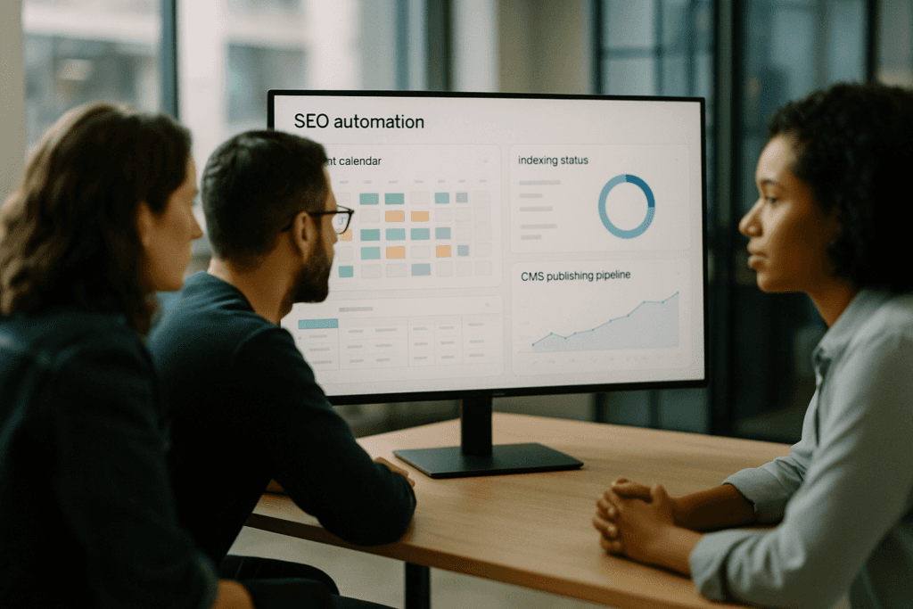 SEO automation tools are software platforms that automate repetitive SEO work like keyword research, content briefs, drafting, on-page checks, CMS publishing, and indexing notifications. The best SEO automation tools add governance and reporting so teams can ship more pages per month, reduce errors, and measure indexing and traffic impact by topic and intent.